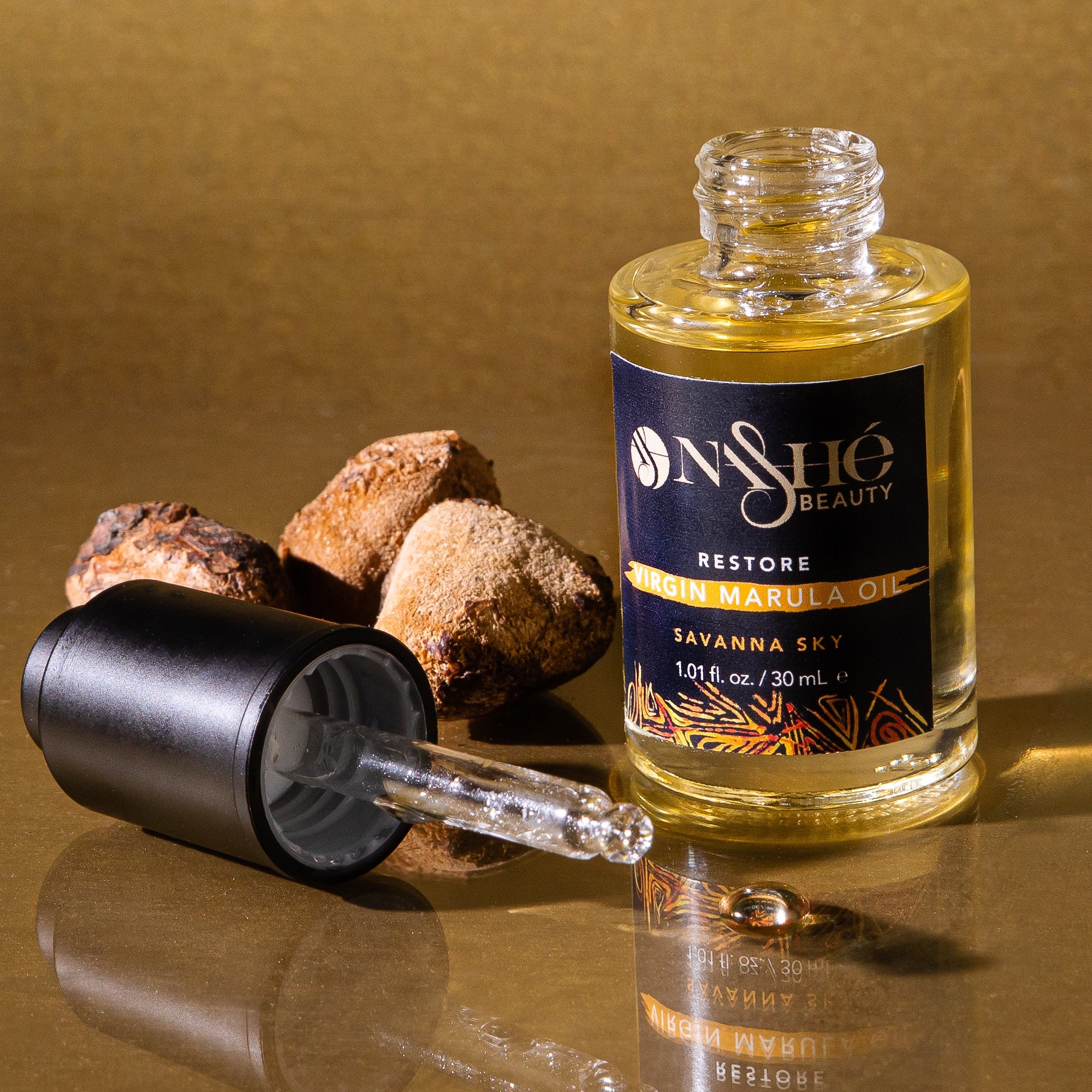 Our Restore - Virgin Marula Oil is a giver that works to restore your beauty. It is very high in Vitamin E and also contains Oleic, Linoleic and amino acids, and anti-oxidants (tocotrienol, phenolic, flavonoids, omega 3 and 6) that are known to slow down visible fine lines of aging and improve elasticity, resulting in smoother, glowing skin.